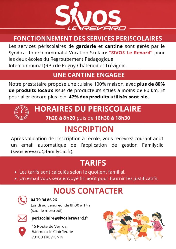 Les services périscolaires sont gérés par le SIVOS LE REVARD depuis le 1er septembre 2024, pour tout renseignement vous pouvez vous adresser au secrétariat du Sivos le lundi matin de 8h à 12h et le jeudi de 8h à 17h au 04.79.34.86.26 ou par mail à secretariat@sivoslerevard.fr.